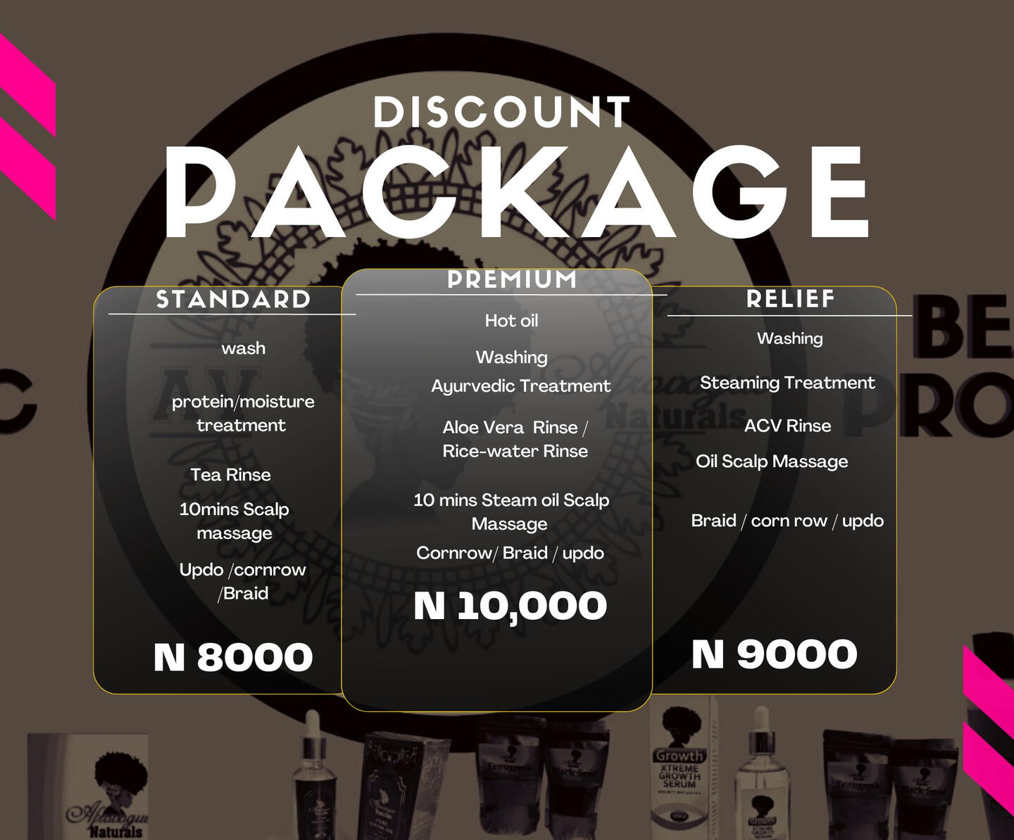 Afrovogue Naturals committed and competent team is here to help keep your hair, nails, skin, and body healthy and beautiful. In addition to our regular beauty services such as pedicures, manicures, and hair services we will continue to perfect our skills and keep educated on all the latest styles. Enjoy our wide range of services in a cozy and luxurious environment. We look forward to serving you!